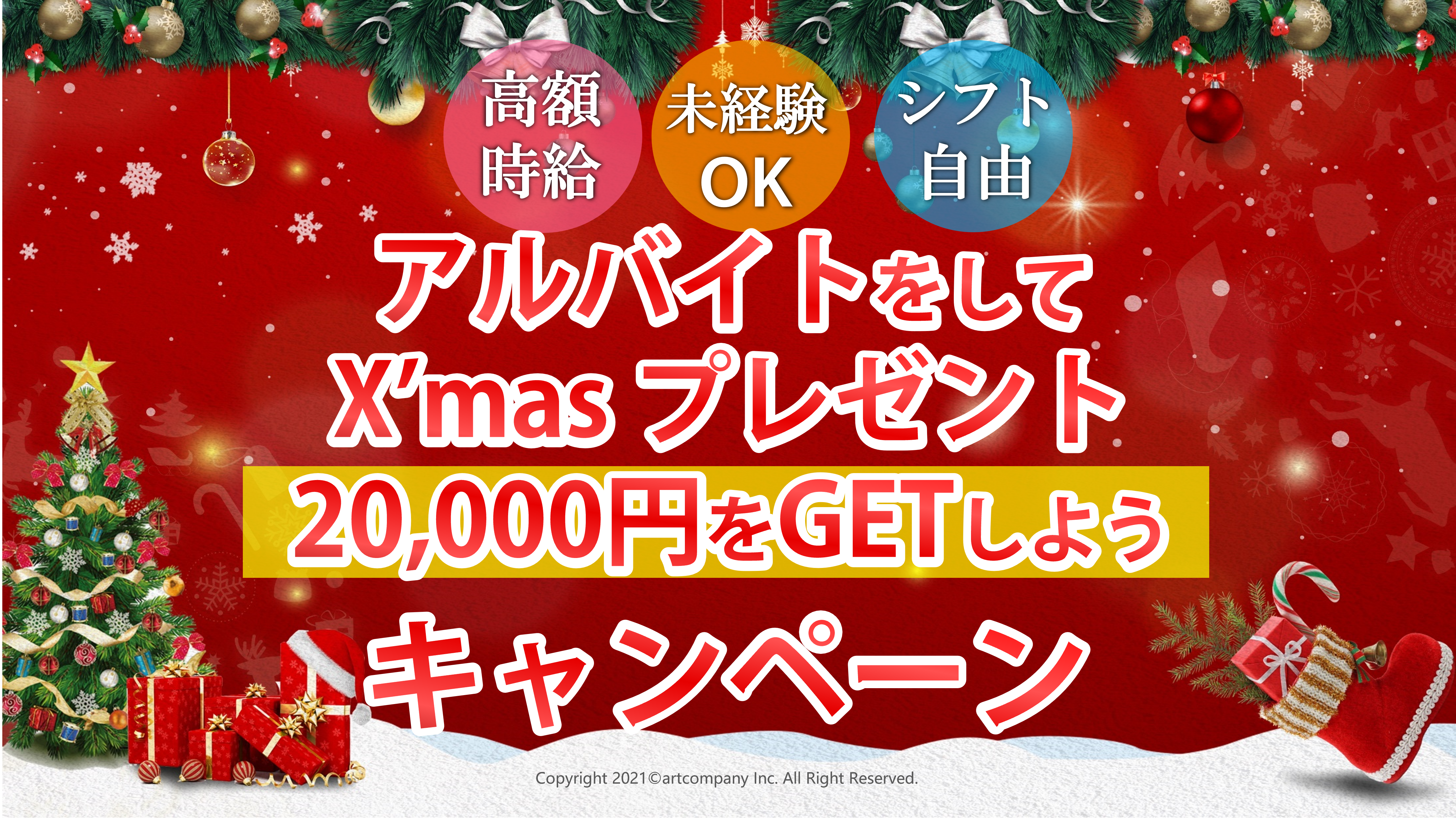 今回は12月~1月3日までの期間内に、アルバイトに出て頂いた方へX’masプレゼントをさせていただきます♪プレゼントを受け取れる条件を下記に記載しました。どうぞご確認ください。